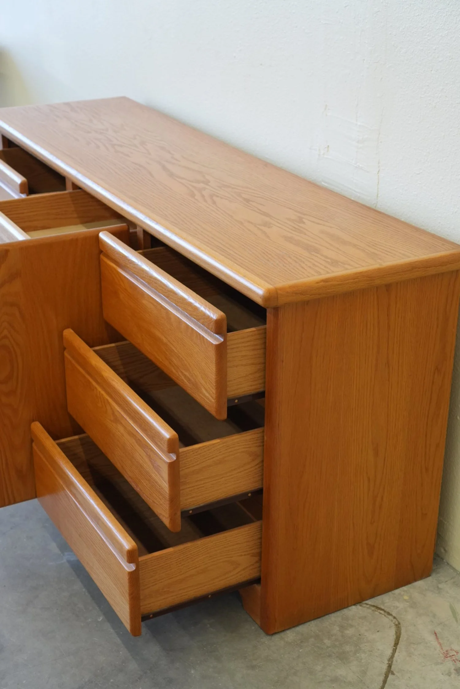 Crafted from high-quality oak wood, this dresser showcases a rich, warm finish with beautiful natural grain patterns. The design features a unique geometric panel layout with multiple drawers.